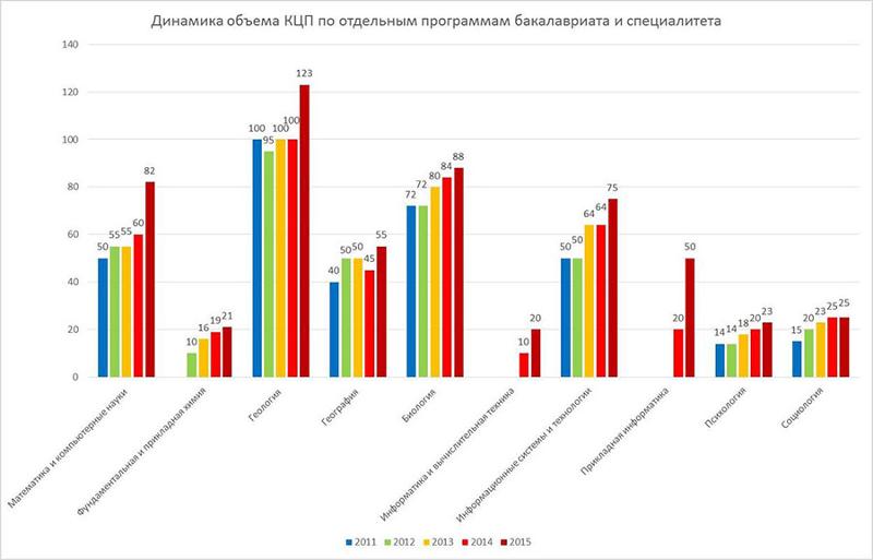 Что касается программ бакалавриата и специалитета, наиболее стремительными темпами растут показатели КЦП по ряду ИТ-направлений – «Математика и компьютерные науки», «Информатика и вычислительная техника», «Информационные системы и технологии», «Прикладная информатика», а также по ряду классических направлений и специальностей университета преимущественно естественно-научного профиля.
