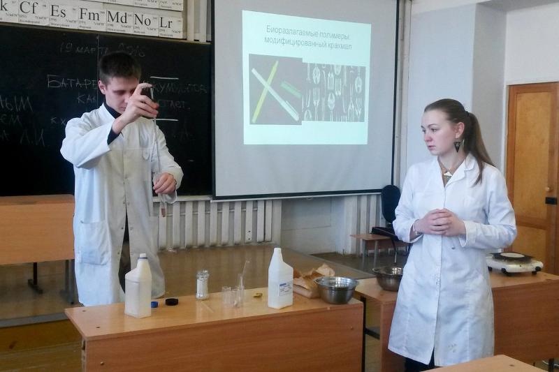 Студенты химического факультета Анна Елисеева и Александр Миляев помогли дополнить увлекательное путешествие в мир макромолекул рядом демонстрационных экспериментов, благодаря чему присутствующие самостоятельно убедились в разнообразных свойствах высокомолекулярных соединений.