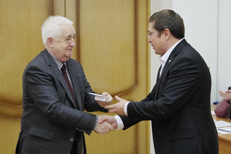 Открылось заседание торжественным вручением дипломов доктора химических наук представителям химического факультета ВГУ Александру Зяблову и Андрею Потапову. Медалями «За заслуги в подготовке защитников отечества» были награждены декан факультета компьютерных наук Эдуард Алгазинов, декан математического факультета Александр Баев, декан геологического факультета Виктор Ненахов, декан факультета прикладной математики, информатики и механики Александр Шашкин, декан экономического факультета Павел Канапухин.