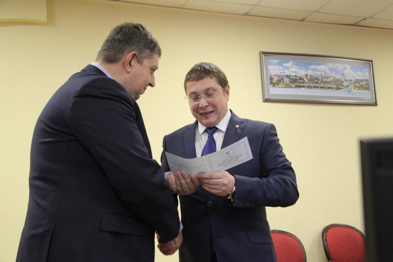 Открылось заседание вручением аттестатов профессора декану факультета прикладной математики, информатики и механики Александру Шашкину и заведующему кафедрой оптики и спектроскопии физического факультета Олегу Овчинникову.