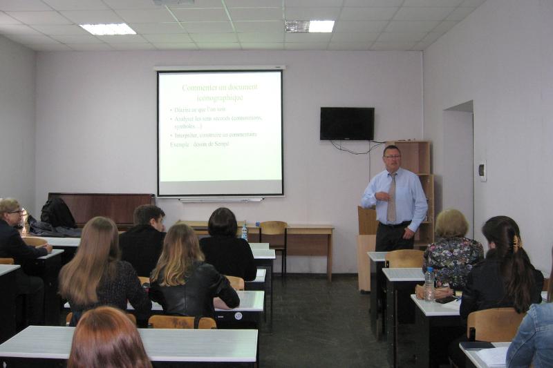 Во время своего пребывания доктор Лоран Сеноз провел серию консультаций с преподавателями, осуществляющими учебный процесс по магистерской программе «Преподавание иностранных языков с использованием онлайн-технологий» (направление 44.04.01. – Педагогическое образование). Он провел 10 часов учебных занятий со студентами, обучающимися по данной магистерской программе, по следующим дисциплинам учебного плана: «Методология обучения в лингвистическом образовании», «Английский язык в профессиональной коммуникации», «Профессионально-ориентированная коммуникация на втором и третьем (французском) иностранном языке». Кроме того гость вуза посетил занятия магистров в рамках производственной педагогической практики и принял участие в их обсуждении. Перечисленные виды учебной деятельности осуществлялись в соответствии с планом реализации проекта Темпус 544161-TEMPUS-1-2013-1-UK-TEMPUS-JPCR Aston University «Developing the Teaching of European Languages: Modernising Language Teaching through the Development of Blended Masters Programmes – DeTEL», участником которого от университета Кан-Нижняя Нормандия является господин Сеноз.
