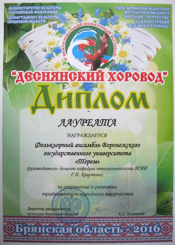 Фольклорный ансамбль Воронежского государственного университета «Терем» (руководитель – Галина Христова) принял участие в IV Межрегиональном фольклорном фестивале «Деснянский хоровод», проходившем в Брянской области и городе Брянск 10–12 июня. В фестивале приняли участие 19 фольклорных коллективов из разных регионов России, каждый из которых представлял песенные традиции своего региона. Заключительный гала-концерт проходил в День России на главной городской площадке Брянска.