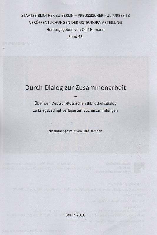24 мая состоялось представление издания «Через диалог к сотрудничеству: Германо- Российский библиотечный диалог о перемещенных в результате Второй мировой войны книжных коллекциях» («Durch Dialog zur Zusammenarbeit: Über den Deutsch-Russischen Bibliotheksdialog zu kriegsbedingt verlagerten Büchersammlungen». - Berlin, 2016).