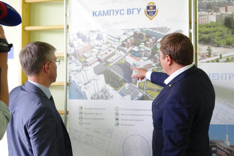 После плодотворного общения со студентами ректор ВГУ Дмитрий Ендовицкий показал Евгению Ревенко северный кампус университета – новый учебный корпус экономического факультета, Концертный зал вуза, новое студенческое общежитие, плавательный бассейн. Дмитрий Александрович представил также концепцию учебно-лабораторного комплекса «Центр информационных технологий», который будет располагаться в кампусе.