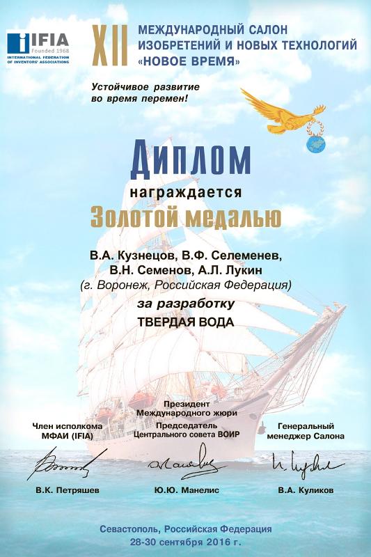 Салон «Новое время» является общепризнанной и авторитетной площадкой, которая способствует продвижению продукции и услуг разработчиков и производителей на национальный и мировой рынок. В форуме приняли участие более 340 участников из 27 стран мира. Воронежский государственный университет представил свою разработку – инновационную систему сохранения влаги в почве «Твердая вода», авторами которой являются учёные химического факультета Владимир Селеменев, Виктор Семенов, Вячеслав Кузнецов и Анна Зенищева. По результатам конкурсного отбора разработка отмечена золотой медалью.
