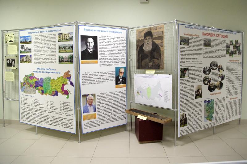 Красочные стенды рассказывают о достижениях почвоведов ВГУ, которые в течение многих лет обследовали территории общей площадью более 20 млн. га. Итогом этой работы стало создание крупномасштабных почвенных карт с агрохимической характеристикой, были разработаны научные рекомендации по рациональному использованию и охране почв.