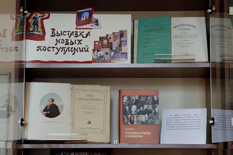 В экспозиции можно увидеть издания конца XIX века («Филологические записки», 1899, № 1), первой половины ХХ века (Лермонтов М.Ю. «Избранные произведения», 1936), книги с автографами известных ученых-филологов, молодых авторов Г.Ф. Ковалеву. На выставке представлены экземпляры, привлекающие внимание полиграфическим исполнением (Пушкин А.С. «Евгений Онегин: роман в стихах», 2013; Пушкин А.С. «И сердце вновь горит и любит», 2016).