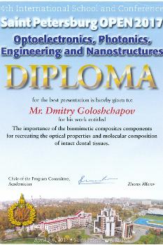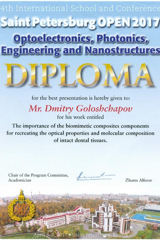 По итогам работы школы-конференции доклад ведущего инженера нашего вуза Дмитрия Голощапова «The importance of the biomimetic composites components for recreating the optical properties and molecular composition of intact dental tissues» был признан лучшим, а его автор награжден почетными призами. Исследования по данной тематике проводятся в рамках гранта Российского научного фонда «Разработка эффективных методов превентивной стоматологической помощи за счет нормализации обменных процессов в твердых тканях человеческого зуба in vivo с использованием биомиметических материалов, обладающих высоким реминерализационным потенциалом» (руководитель – доцент Павел Середин).
