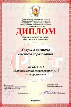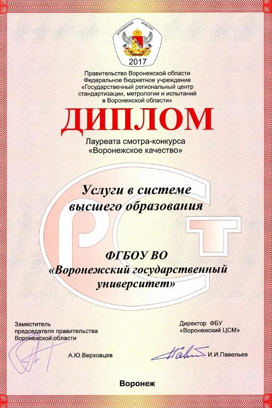 Воронежский государственный университет в третий раз стал лауреатом XX ежегодного регионального смотра-конкурса «Воронежское качество» в номинации «Услуги в системе высшего образования». Данный конкурс является региональным этапом Всероссийского конкурса «100 лучших товаров России». Организаторами мероприятия выступили правительство Воронежской области, ФГУ «Воронежский центр стандартизации, метрологии и сертификации», Воронежское отделение Академии проблем качества и Совет промышленников и предпринимателей Воронежской области.