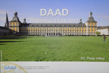 Петер Хиллер представил презентацию о службе обменов. Основными целями DAAD являются обеспечение стипендий для иностранных и немецких студентов и молодых ученых, интернационализация вузов, поддержка германистики и немецкого языка, а также сотрудничество в области образования с развивающимися странами.