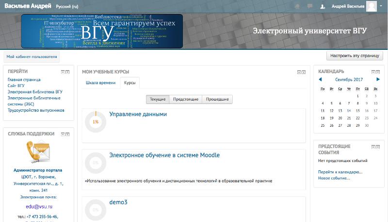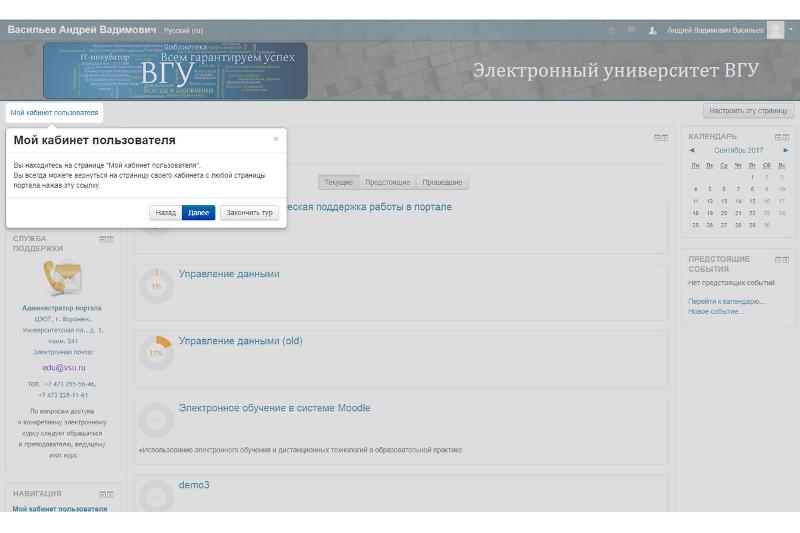 За последние три года образовательный портал ВГУ претерпел существенные изменения. Самое заметное – обновление дизайна, теперь он адаптирован для всех устройств. Благодаря этому появилась возможность для любой страницы добавлять виртуальные туры, которые позволяют пользователю быстро привыкнуть к интерфейсу.