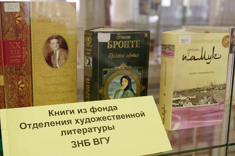 Из 3 миллионов 200 тысяч экземпляров книжного собрания университетской библиотеки в фестивале принимают участие издания, выпущенные в малом количестве экземпляров, в том числе альбомы по искусству: «Великие музеи мира», «Золотой век нидерландской живописи», «Дворцы Рима», «Народное искусство России», уникальная книга – «Древности Российского государства» и другие. Художественная литература из фондов ЗНБ ВГУ представлена изданиями, пользующимися наибольшим читательским спросом. Среди них произведения Дж. Чосера, У. Шекспира, Г. Филдинга, О. Памука. В экспозиции выставки также представлены книги-миниатюры, литература на иностранных языках. Посетители смогли увидеть интереснейшие книги, которые вызывают особый интерес у полиглотов и книжных гурманов, – «Введение в китайскую иероглифику», «Грамматика коптского языка», «1000 базовых иероглифов японского языка», «Микроязыки. Интерязыки», «Oxford: history of the classical world».