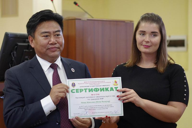 Торжественное вручение сертификатов о прохождении стажировки в Воронежском госуниверситете представителями канцелярии Госсовета КНР состоялось в конференц-зале Главного учебного корпуса вуза.