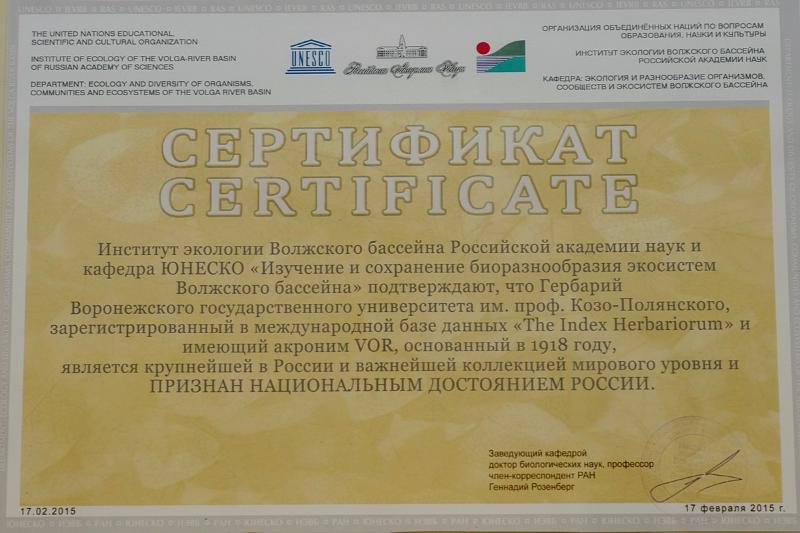 Гербарий ВГУ признан ЮНЕСКО национальным достоянием Российской Федерации, является крупнейшей в России и важнейшей коллекцией мирового уровня.
