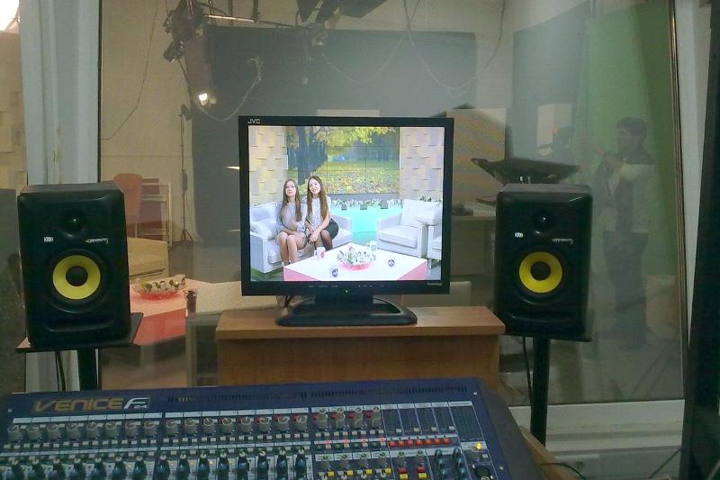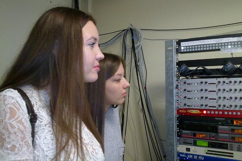 Заглянув в студию звукозаписи, студенты с огромным вниманием и заинтересованностью ознакомились с процессом редактирования звука, засыпали звукооператора вопросами. Не меньший интерес вызвало посещение студии, где выпускают в эфир новостные программы.