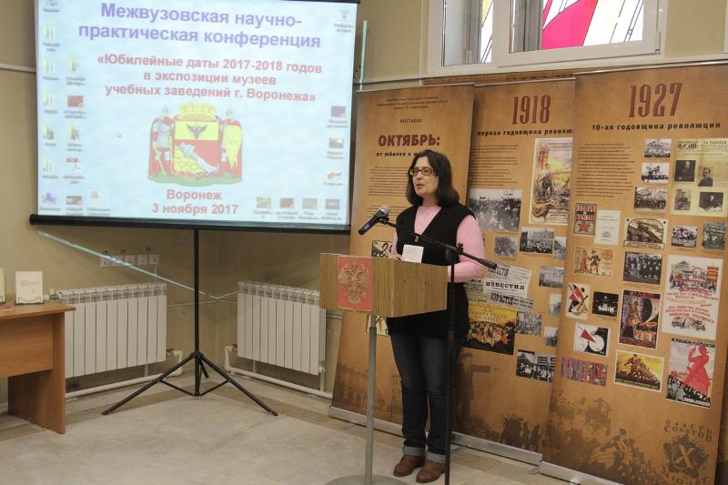Опыт и проблемы повышения эффективности музейной работы в вузах в свете возможностей, которые дают юбилейные даты 2017 и 2018 годов – 100-летие Русской революции, 100-летие комсомола, 105-летие ВГАУ им. Императора Петра I, 100-летие ВГУ и высшего медицинского образования, 75-летие освобождения Воронежа от фашистских захватчиков, были рассмотрены в содержательных докладах и сообщениях. С ними выступили В.С. Листенгартен, А.Е. Степынина, И.В. Подкопаева, Ж.А. Леденева, Г.М. Мелькумов, А.Н. Акиньшин (ВГУ), Т.Н. Чернобоева (ВГПУ), Л.И. Мацаева (ВГМУ им. Н.Н. Бурденко), А.В. Курьянов и Е.В. Рощупкина (ВГАУ им. Императора Петра I), С.М. Прожеторко (ВУНЦ ВВА им. Н.Е. Жуковского и Ю.А. Гагарина), М.В. Медведева (ВГТУ), И.В. Медовник (ВГУИТ). О работе музейно-выставочного комплекса Тамбовского государственного университета им. Г.Р. Державина, готовящегося в 2018 году отметить вековой юбилей, рассказала Н.Н. Бурдюкина. С интересом были восприняты выступления участников музейной работы из юридического техникума и школ Воронежа и Лисок.