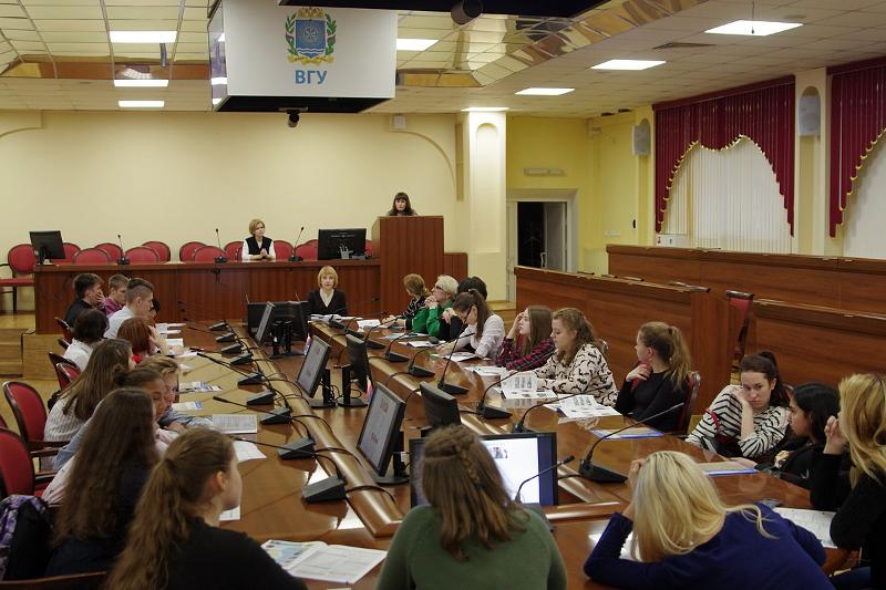 В Музее истории Воронежского госуниверситета ребята узнали об истории, факультетах, традициях, выставках вуза познакомились с фондом уникальных книг. О правилах приёма, особенностях поступления и обучения, проходных баллах, льготах, УВЦ, подготовительных курсах, профориентационном тестировании в ВГУ, сайте для абитуриентов рассказала начальник отдела довузовского образования ВГУ Людмила Самохвалова. Заместитель декана факультета журналистики, доцент кафедры связей с общественностью Екатерина Курганова, рассказала об особенностях обучения на факультете, новом направлении – «Военная журналистика», творческом конкурсе и конкурсном собеседовании, а также пригласила на олимпиаду «Проходной балл» и школу юного журналиста. Методист отдела довузовского образования Лариса Сертакова рассказала о возможностях, которые предоставляет университет старшеклассникам, в частности, Научном обществе учащихся, олимпиадном движении, профориентационных мероприятиях, Лиге Инноваций, проекте ВГУ–LIVE, пригласила добавиться в группы ВКонтакте факультетов, познакомила с адресами сайтов, Электронным университетом.