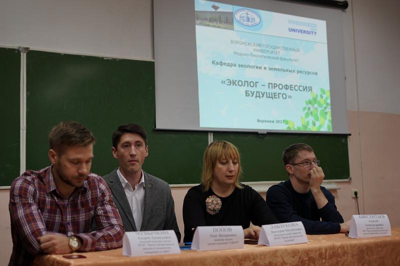 После приветственного слова зав. кафедрой экологии и земельных ресурсов, профессора Татьяны Девятовой выступили инженер-эколог группы компаний «СИБУР» Олег Попов, ведущий инженер-эколог Центра лабораторного анализа и технических измерений по ЦФО Андрей Чувычкин, исполнительный директор Центра экологической политики Виктория Лабзукова, заместитель директора Воронежского регионального центра по обращению с отходами Алексей Авксентьев. В своих выступлениях гости университета осветили профессиональные аспекты работы эколога на предприятиях города, общественных и проектных организациях, аналитических лабораториях.