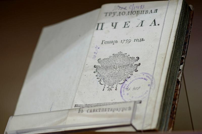Среди экспонатов выставки большой интерес представляют издания А.П. Сумарокова «Краткая московская летопись» (СПб., 1874), «Очерки жизни и избранные сочинения Александра Петровича Сумарокова, изданные Сергеем Глинкою» (СПб., 1841). Также внимания заслуживает и один из томов журнала «Трудолюбивая пчела» – первый русский частный журнал, который издавал Александр Сумароков. Он выходил с января по декабрь 1759 года. В журнале сотрудничали такие известные литераторы и ученые, как В.К. Тредиаковский, А.А. Нартов, И.А. Дмитриевский, А.О. Аблесимов и другие. В журнале публиковались статьи по истории, филологии, философии. Большую его часть занимали сочинения самого автора. Именно А.П. Сумароков писал злободневные статьи, в которых обличал взяточничество, деспотизм и самодурство помещиков. Автор поддерживал мысль о том, что знатность, богатство и высокое положение в обществе не всегда являются следствием личной добродетели человека.