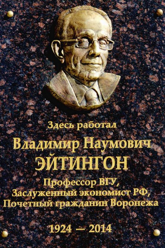 Владимир Эйтингон ушел из жизни четыре года назад. Мемориальная доска – скромное напоминание о его огромном вкладе в развитие экономического факультета и Воронежского государственного университета. С инициативой об увековечении памяти профессора в преддверии празднования 100-летнего юбилея ВГУ выступили его ученики, коллеги, представители общественности. Автором мемориальной доски стал воронежский художник Владимир Сидоров.