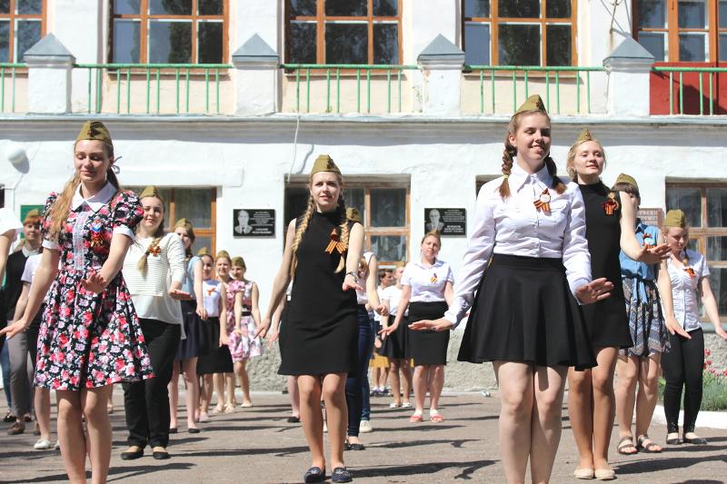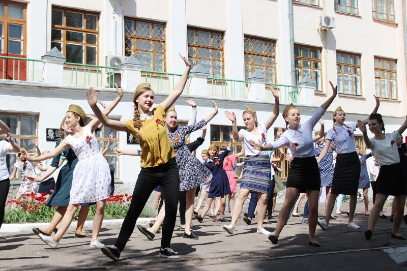 Завершил акцию студенческий флэш-моб. Сто студенток в солдатских пилотках лихо зажигали под легендарную «Катюшу».