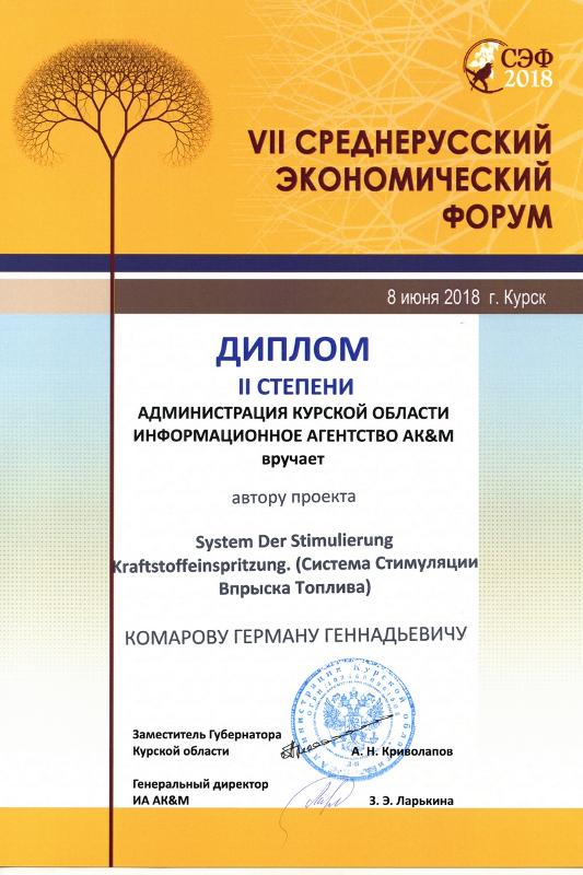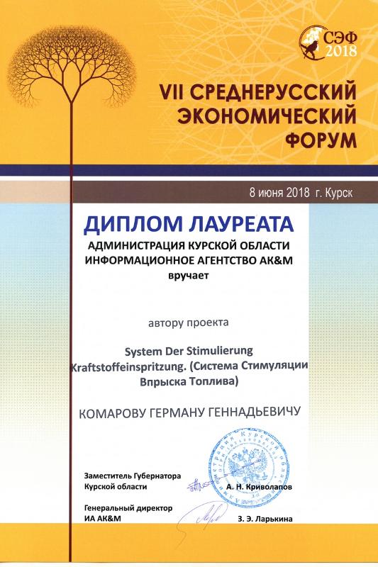 Проект устройства Князь-1 стал основой для внедрения технологии на предприятиях Воронежа в виде ряда систем стимуляции впрыска топлива, что позволило сократить топливные издержки. В форуме приняло участие более 80 проектов, каждый из которых оценивали эксперты различных отраслей. По его итогам одноименный проект – System Der Stimulierung Kraftstoffeinspritzung (Система стимуляции впрыска топлива), основанный на технологии, прошедшей апробацию в ряде инстанций, в том числе Государственном научном центре РФ «НАМИ», был удостоен второго места, а автор – Комаров Герман награжден дипломом второй степени от Администрации Курской области, Информационного агентства АК&M и дипломом лауреата VII Среднерусского экономического форума.