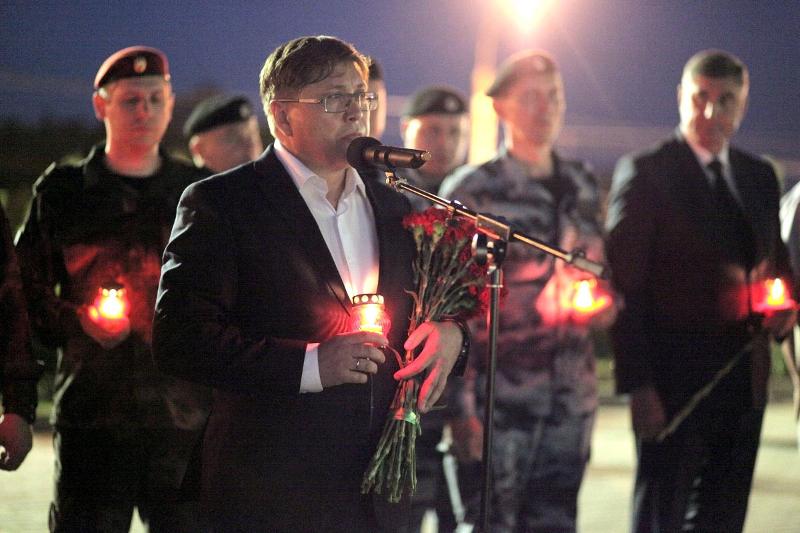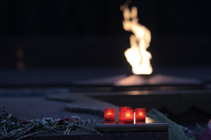 Участники акции пронесли по ступеням мемориала горящие свечи как символ всенародной памяти и признательности всем, кто выстоял и победил в борьбе с фашистскими захватчиками. Память погибших почтили минутой молчания и возложили цветы.