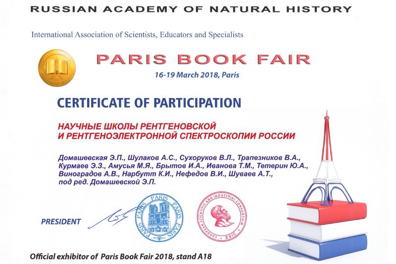 В специальный каталог «PARIS BOOK FAIR 2018» вошли две работы профессора ВГУ. Одна из них – монография «Научные школы рентгеновской и рентгеноэлектронной спектроскопии России» под редакцией Эвелины Домашевской, которая вышла в свет в Издательском доме ВГУ еще в 2015 году.