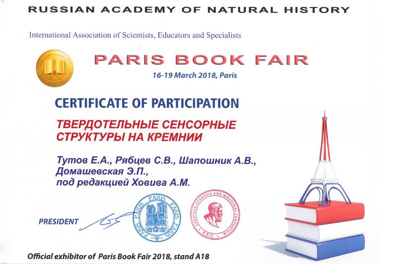 Учебное пособие «Твердотельные сенсорные структуры на кремнии» (авторы: Е.А. Тутов, С.В. Рябцев, А.В. Шапошник, Э.П. Домашевская) было представлено в экспозиции Российской Академии Естествознания. Она объединила научные и учебно-методические издания, которые раскрывают тенденции развития науки в России.