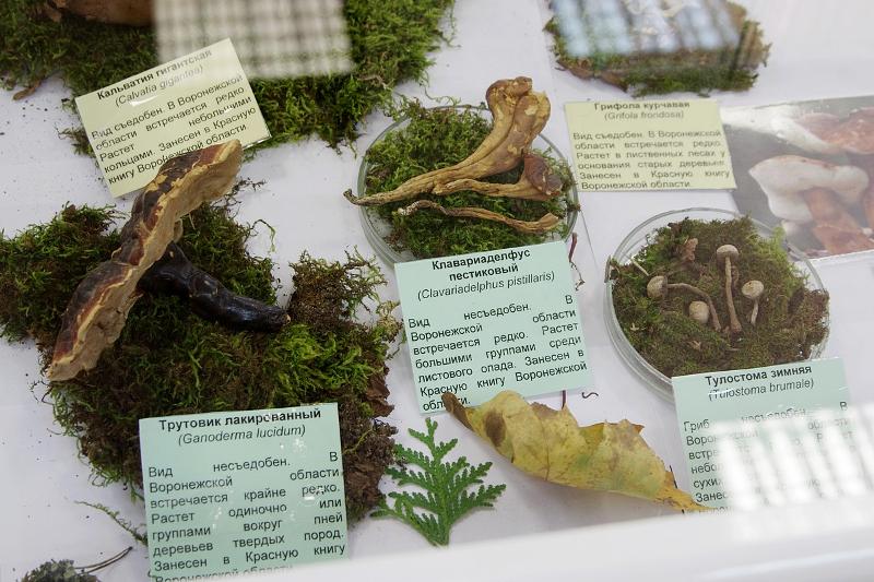 На выставке представлены таксономические группы грибов из классов сумчатых и базидиальных грибов, и грибообразных протистов (миксомицетов), произрастающих в разнотипных лесных и лесопарковых сообществах Воронежской области. В витринах выставки можно увидеть грибы, применяемые в пищевой промышленности, медицине, декоративно-прикладном искусстве. В экспозиции представлены и съедобные грибы – белые, подберезовики, лисички, опята, а также их ядовитые собратья: ложные опята и свинушки и самый опасный гриб – бледная поганка.