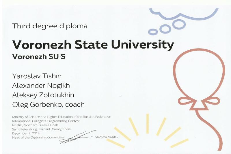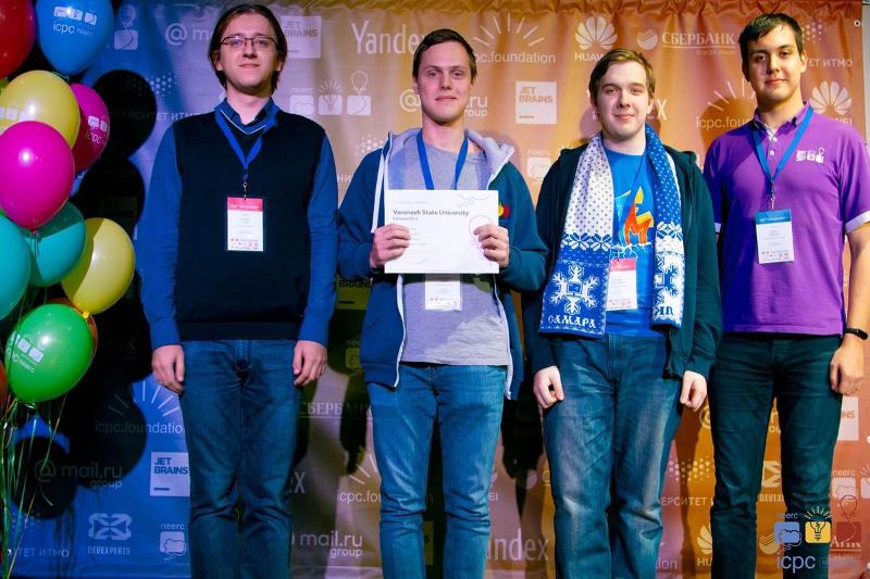 Университет ИТМО уже много лет является центром северо-восточной европейской зоны, которая в этом году преобразована в регион «Северная Евразия». В этом этапе чемпионата мира принимали участие студенческие команды, успешно выступившие в четвертьфинальных соревнованиях в октябре текущего года. Среди них – команда Воронежского университета в составе: Александр Ногих, магистрант 2 года обучения факультета компрьютерных наук, Алексей Золотухин и Ярослав Тишин, студенты 4 курса факультета ПММ. Команда нашего университета завоевала Диплом III степени.