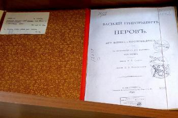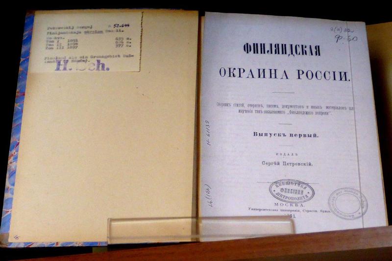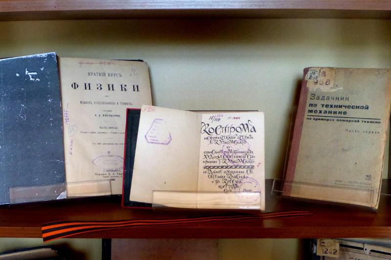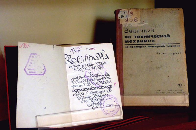 Выставка, открытая в отделе редких книг, так и называется «Книги из фашистского плена». Это разнообразные по тематике издания. Среди них: «Финляндская окраина России» (1881); Собко Н.П. «Василий Григорьевич Перов. Его жизнь и деятельность» (1892); Лукомский Г.К. «Кострома. Исторический очерк» (1913); Чебышев П.Л. «Теория вероятностей» (1936); Левицкая М. «Лекции по теории атома» (1936). На экземплярах – характерные пометы: ярлыки, штемпели, печати, подтверждающие, что книги находились в фашистском плену: Sonderkommando, H. Sch., Cb 348, Eb 1242.