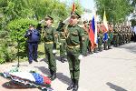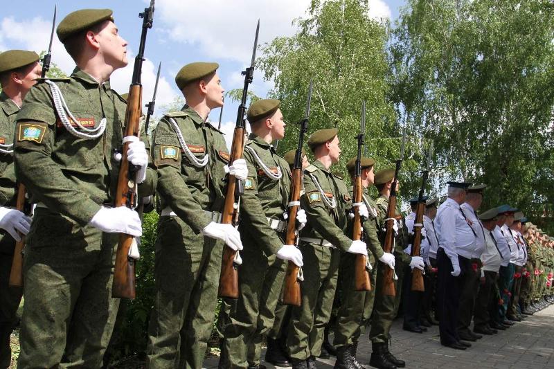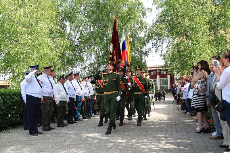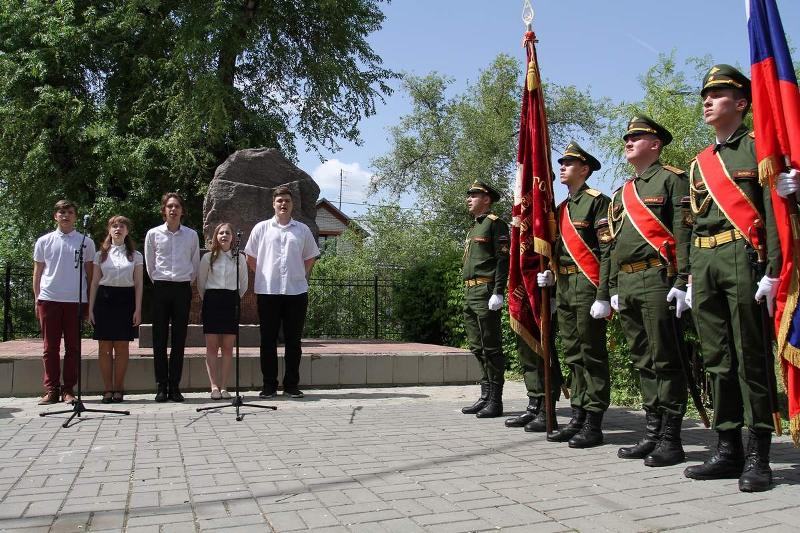 Сквозь живой коридор участников митинга под бой барабанов к памятнику сотрудникам и студентам, погибшим во время Великой Отечественной войны, прошел взвод почетного караула и знаменная группа курсантов Учебно-военного центра ВГУ.