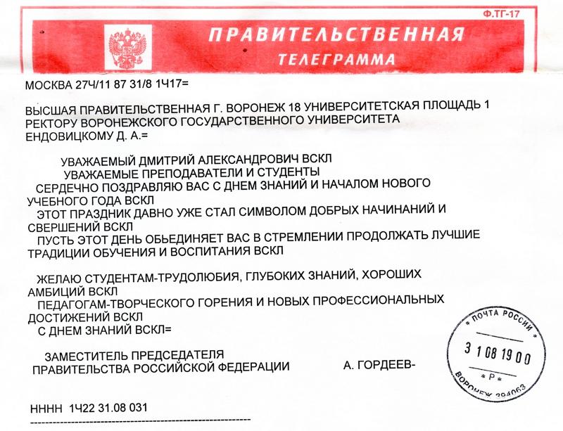 Праздники, даты, юбилеи, Сотрудничество / Просмотров: 1407Заместитель Председателя Правительства Российской Федерации Алексей Гордеев поздравил Воронежский государственный университет с началом учебного года.
