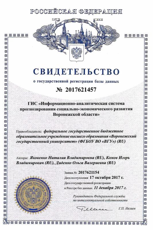 − Сегодня проблемам исследования социально-экономического развития регионов России уделяется большое внимание. В прошлом году мы реализовали проект под названием «Информационно-аналитическая система прогнозирования социально-экономического развития Воронежской области», результаты которого выявили «уязвимые» места региональной экономики. У нас есть более шестидесяти публикаций в журналах ВАК, пять публикаций, индексируемых в Scopus и Web of Science, также три патента на регистрацию базы данных в Роспатенте. Новый проект продолжает начатое исследование, − рассказала Наталия Яковенко.