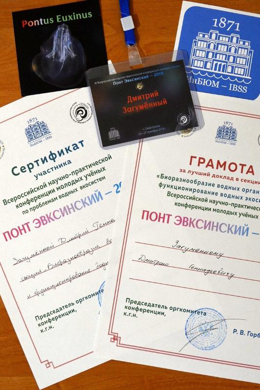 23–27 сентября аспирант медико-биологического факультета ВГУ Дмитрий Загумённый принял участие в работе XI Всероссийской научно-практической конференции для молодых учёных по проблемам водных экосистем «Понт Эвксинский – 2019», которая проходила в Севастополе. Мероприятие было организовано на базе Института биологии южных морей имени А.О. Ковалевского Российской академии наук.