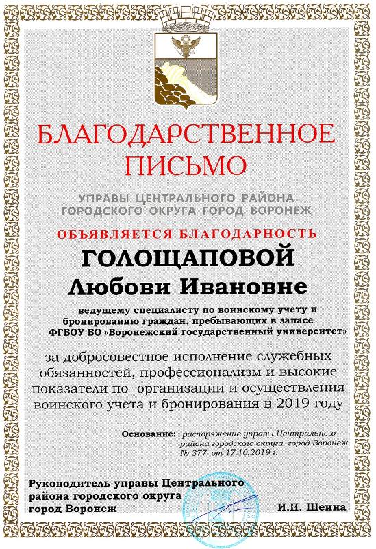 17 октября руководитель управы Центрального района городского округа город Воронеж Инна Шеина объявила благодарность ведущему специалисту по воинскому учету и бронированию сотрудников ВГУ, пребывающих в запасе, Любови Голощаповой за добросовестное исполнение служебных обязанностей, профессионализм и высокие показатели по организации и осуществлению воинского учёта и бронирования в 2019 году.