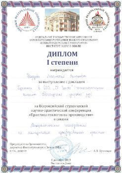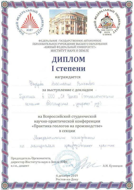 В начале декабря на базе Южного федерального университета состоялась Всероссийская студенческая научно-практическая конференция «Практика геологов на производстве». Студентка геологического факультета Воронежского государственного университета Анастасия Назарова получила диплом первой степени за доклад на тему «Практика в ООО «СЛ Золото» (технологические аспекты обогащения «упорных руд). Она представила новый способ добычи золота.