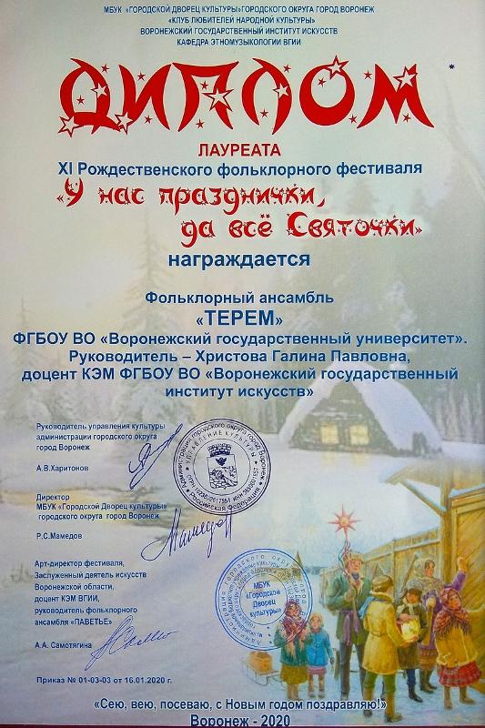 19 января фольклорный ансамбль «Терем» стал участником XI Рождественского фольклорного фестиваля, который состоялся в городском дворце культуры Воронежа. Около двадцати фольклорных коллективов создали на сцене единое театрализованное действо, посвященное традициям празднования Рождества.