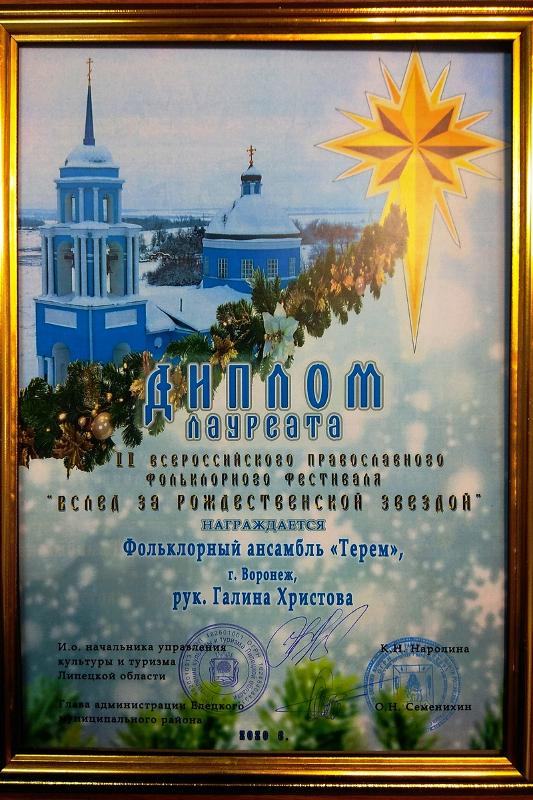 17–19 января в Ельце состоялся II Всероссийский фольклорный фестиваль «Вслед за Рождественской звездой». Он включал в себя творческие лаборатории, концерты, творческое общение коллективов. Ансамбль «Терем» (руководитель – Галина Христова) представлял южнорусские песенные традиции. Помимо «Терема» свое мастерство продемонстрировали лучшие творческие коллективы из многих регионов России: Москвы, Волгограда, Ставрополя, Липецка, Курска, Саратова, Ленинградской, Ростовской, Псковской областей.