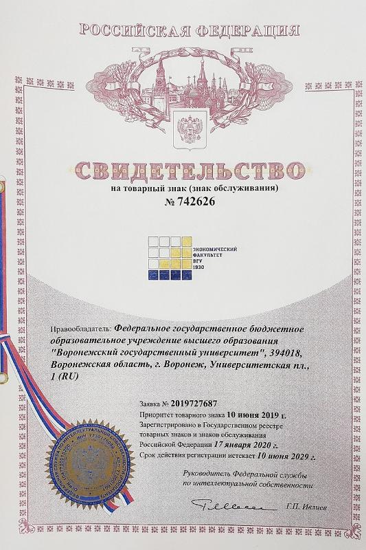 Федеральная служба по интеллектуальной собственности зарегистрировала товарный знак экономического факультета Воронежского государственного университета. В конце января факультет получил сертификат, подтверждающий исключительное право на его использование.