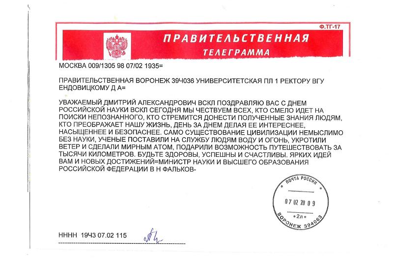Воронежский государственный университет получил телеграмму от министра науки и высшего образования России Валерия Фалькова. Он поздравил коллектив университета с Днем российской науки, пожелав новых достижений.