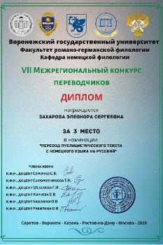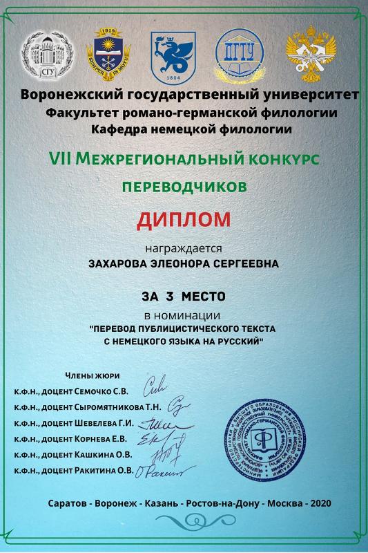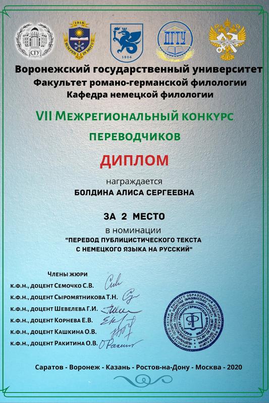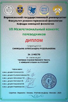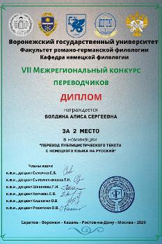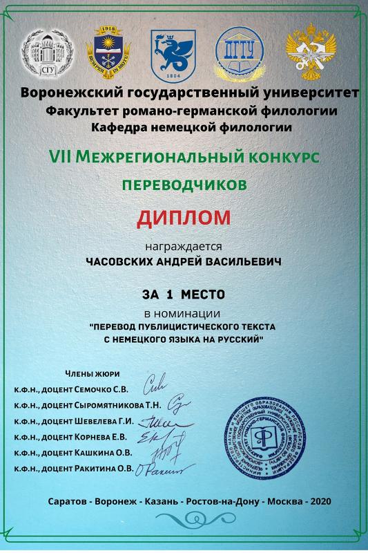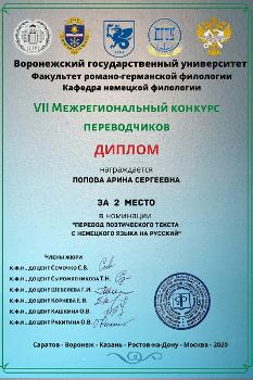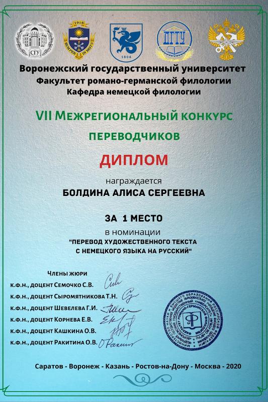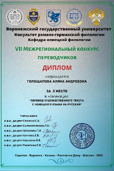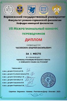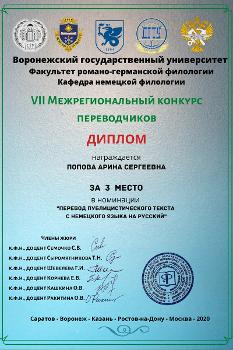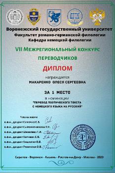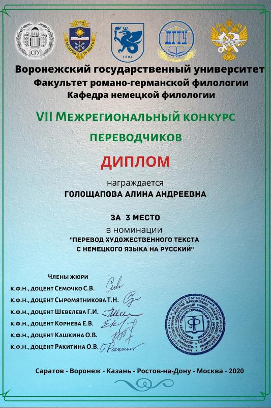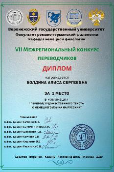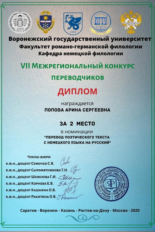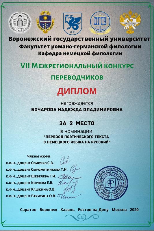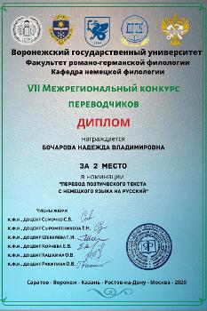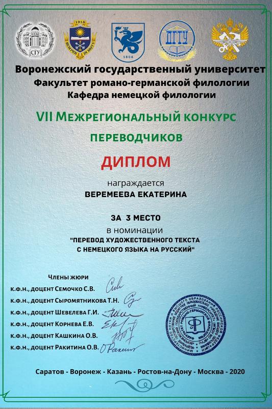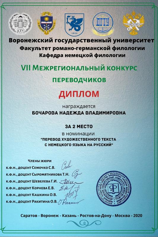 Объявлены результаты второго этапа VII Межрегионального конкурса переводчиков. Участники представили работы в трех номинациях: перевод художественного текста с немецкого языка на русский; перевод текста публицистического стиля (аналитическая статья) с немецкого языка на русский; перевод стихотворения с немецкого языка на русский. Работы студентов Воронежского госуниверситета были отмечены в номинациях: