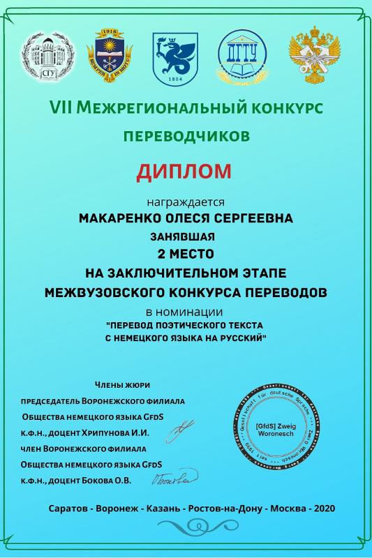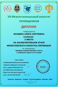 Объявлены результаты заключительного этапа VII Межрегионального конкурса переводчиков. В номинации «Публицистика» победил Андрей Часовских, в номинации «Поэзия» второе место заняла Олеся Макаренко, в номинации «Проза» второе место у Алисы Болдиной.