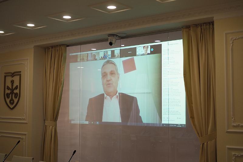 Маркус Эдерер рассказал о координации антикризисных мер в ЕС и отношения между ЕС и РФ в контексте текущего кризиса. Ректор ВГУ Дмитрий Ендовицкий отметил важность международного образовательного сотрудничества, и, в частности, сохранение программы Эразмус+ в нынешних кризисных условиях. Посол ЕС заверил, что академическое сотрудничество после завершения пандемии только усилится, и финансирование проектов программы Эразмус+ не только не сократится, но и удвоится по сравнению с предыдущим бюджетом программы. ЕС возлагает большие надежды на научное сотрудничество с российскими университетами и исследовательскими организациями.