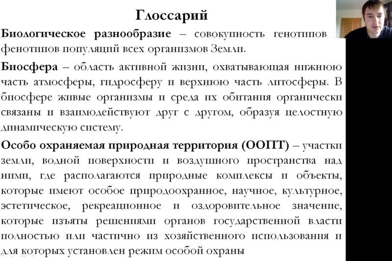 Вниманию аудитории была представлена лекция «Особо охраняемые природные территории Воронежской области», которую провел руководитель Молодежного клуба РГО Воронежской области доцент кафедры рекреационной географии, страноведения и туризма Дмитрий Владимиров. Он рассказал об истории создания сети особо охраняемых природных территорий в России, в частности, подробно остановился на двух природных заповедниках региона — Воронежском и Хоперском. Дмитрий Романович сделал акцент на времени и целях их создания, успехах в природоохранной работе, охраняемых видах растений и животных, обитающих на этих территориях.