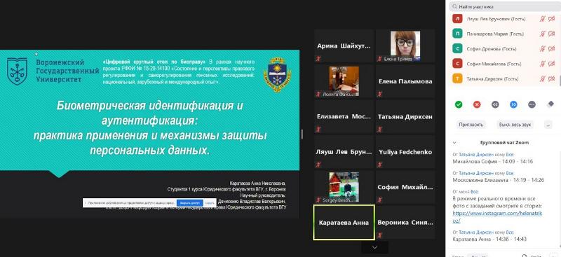 8 июня представители юридического факультета Воронежского государственного университета – доцент кафедры теории и истории государства и права Владислав Денисенко и студентка бакалавриата Анна Каратаева – приняли участие во Всероссийской научной конференции «Цифровой круглый стол по биоправу», посвящённой 100-летию открытия генома. Научная встреча прошла на платформе Zoom. Ее организатором выступила кафедра теории права и сравнительного права МГИМО МИД РФ.