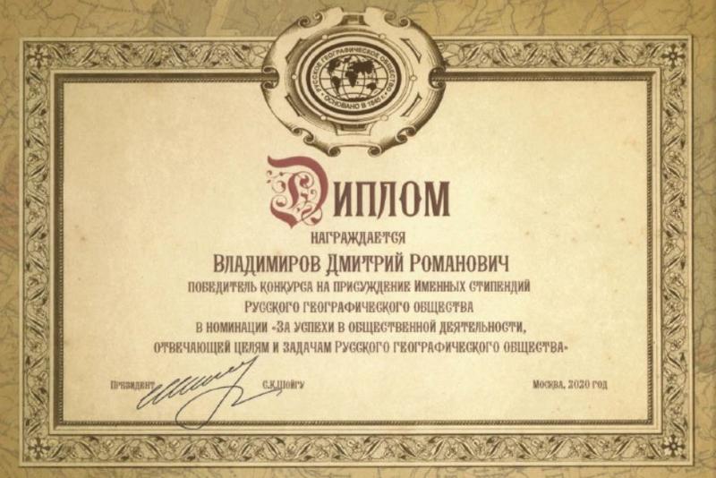 Доцент факультета географии, геоэкологии и туризма Воронежского госуниверситета Дмитрий Владимиров победил в конкурсе на право получения молодёжной именной стипендии Русского географического общества. Учёный стал лучшим в номинации «За успехи в общественной деятельности, отвечающей целям и задачам Русского географического общества».