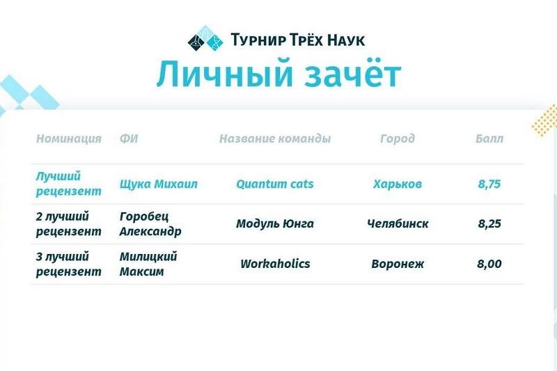 Турнир Трёх Наук – студенческое состязание, цель которого – создание площадки взаимодействия бизнеса и студенчества. Молодые учёные одновременно тренируются, применяя теоретические знания на практике, и находятся под наблюдением специалистов HR компаний-партнеров. Состязание проходит в формате научных боёв, где участвуют три стороны – докладчик, оппонент и рецензент. Их задача – найти оптимальное решение поставленных перед ними проблем, применяя знания сразу трёх наук – физики, химии и биологии. Молодые ученые исследуют проблему, ищут неточности в ответах соперников и пытаются усовершенствовать их решения. За ходом боёв наблюдает высококвалифицированное жюри, состоящее из учёных сферы естественных наук, а также представителей компаний-партнеров Турнира.