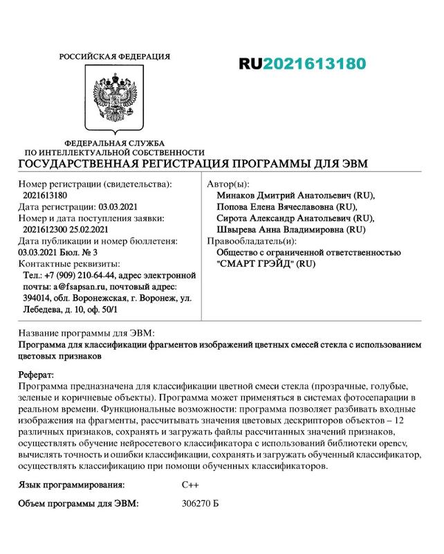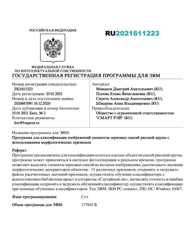За последний весьма непростой год ими совместно с работниками предприятий было получено два свидетельства о регистрации программ ЭВМ, в рамках которых предложены новые подходы к решению задач анализа и фотосепарации неоднородного потока биологических объектов растительного происхождения (зерновые, пищевые смеси).